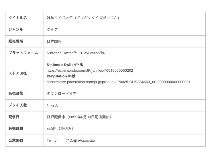 この度、株式会社グランゼーラ(石川県金沢市)は、Nintendo Switch(TM)/PlayStation(R)4用ゲームソフト「雑学クイズ大臣」の配信を開始いたしました。