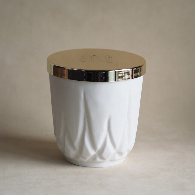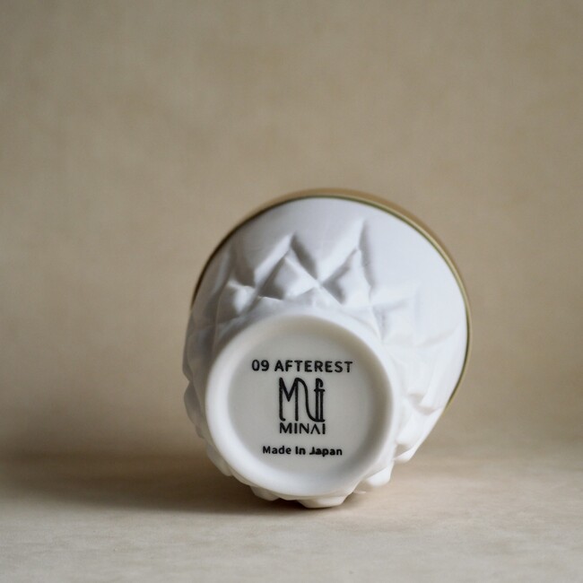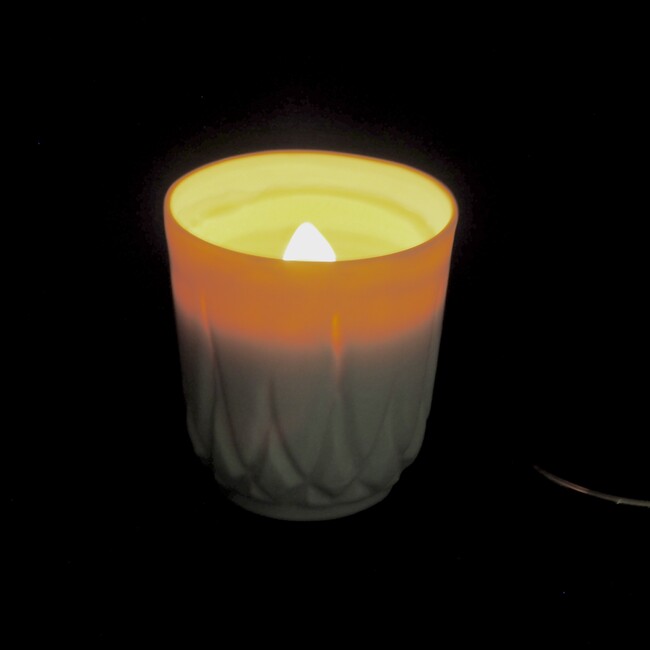 ミナイマサシが削り出したキャンドルを原型に、焼き物として岐阜の陶芸作家の手により、洗練された素材と技法を用いて光が透ける器を実現した。