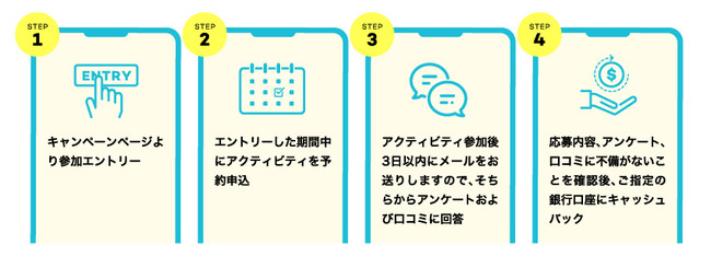 各キャンペーン期間中にエントリーの上、国内・海外のお好きなアクティビティを予約。参加後に当サイトに関するアンケートおよび参加アクティビティの口コミに回答すると、後日アクティビティ料金の半額をキャッシュバック(上限:5万円)。