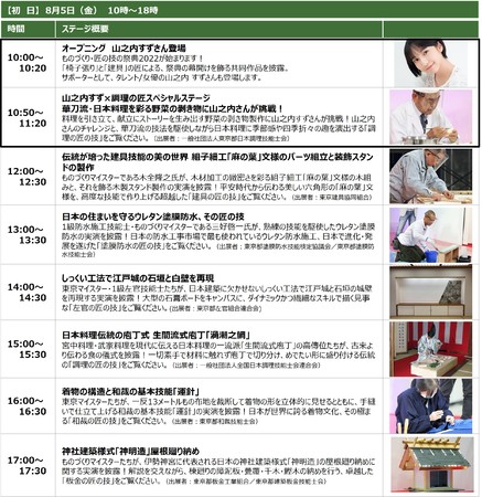 初日(8月5日)のオープニングでは、「椅子張り」と「建具」の匠による、祭典の幕開けを飾る共同作品を披露します。また、祭典サポーターの山之内すずさんが、オープニングの登場に続き、ステージイベントにて、調理の匠に教えてもらいながら、日本料理を彩る“野菜の剥き物製作”に挑戦するスペシャルステージをはじめ、匠によるパフォーマンスが楽しめる数々のステージプログラムを行います。吉本興業所属の芸人さんたちが匠とともにステージに登場、祭典を盛り上げます。