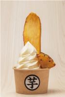 たっぷりのソフトクリームと大学芋があり、ソフトクリームを芋チップでディップし てもよし。そのまま食べてもよし。楽しみ方がいろいろあります。