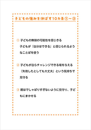 子どもに対しての方法論だけではなく、親としての"あり方"に気づきを得て、子育てにフィードバックする事で、子どもは「強み」を伸ばし未来を切りひらきます。