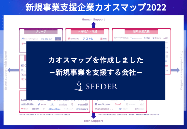 独自の先進データと人材を活用し、商品開発や新規事業創出などの企業のイノベーション創出を支援するSEEDER株式会社が、新規事業を立案 / 推進をするサービスを提供している会社のカオスマップを作成いたしましたことを発表いたします。