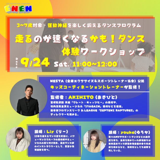 LIFE ENTERTAIN COMPANY ENEN合同会社(東京都渋谷区、以下ENEN)は、コーディネーショントレーニングを取り入れた検証型ダンスワークショップ「かも!ダンス」を9月24日(土)11時から表参道STUDIO TENORASで開催いたします。