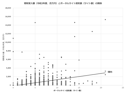■掲載サイト数と寄付額は緩やかに比例しています。