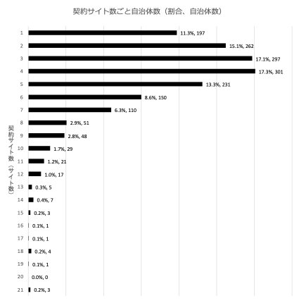 1サイトだけ利用する自治体は全体の11.3%、4サイトを利用する自治体が17.3%と最も多い割合となりました。10サイト以上利用する自治体は92、21サイトを利用する自治体もあり、自治体のふるさと納税への戦略によって大きく差があることが分かりました。