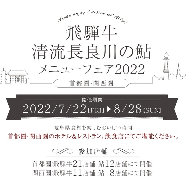 岐阜県では、県産農畜水産物の利用促進とブランド力向上を図るため、大都市圏で各種プロモーションに取り組んでいます。2022年7月22日(金)~8月28日(日)の期間、首都圏・関西圏のホテル、レストラン、飲食店合計38店舗にて「飛騨牛・清流長良川の鮎 メニューフェア2022 首都圏・関西圏」を開催致します。