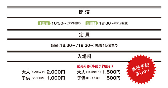 開演時間:1回目18:30 ~(30分)、2回目 19:30~(30分)
