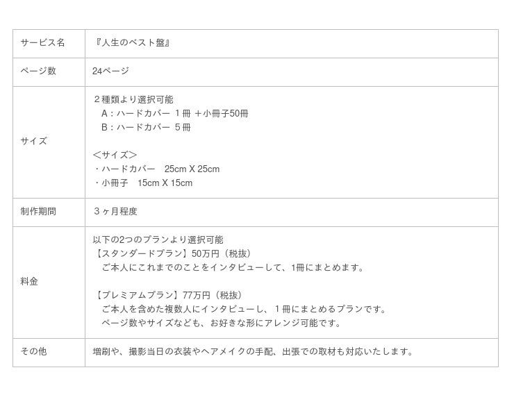 人生のストーリーに加え、撮り下ろしの写真やその人らしさを表現するデザインで楽しく読み切れる、何度でも読み返したいと思える、「らしさ」あふれる1冊になるのが特徴です。