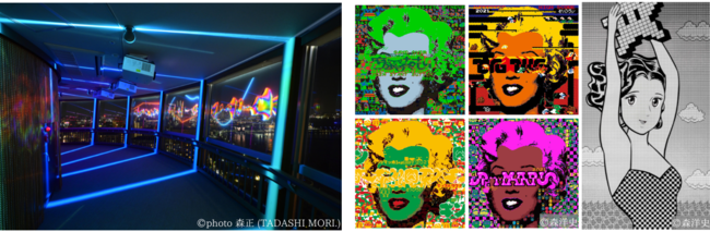 夜の展望フロアでは、横浜の風景と重ね合わせて映像の新しい表現を生み出しているメディアアーティストの 作品を体験していただける空間となっております。
