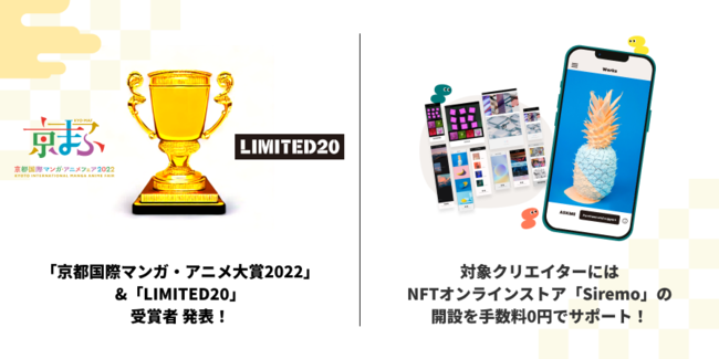クリエイター・アーティスト向けにNFTオンラインストアを開発している株式会社Siremo(東京都港区、代表取締役CEO:金田悠希、以下 Siremo)は、2022年9月17日(土)・18(日)に行われた『京都国際マンガ・アニメフェア2022(以下、京まふ)』のスポンサーとして参画しました。「京都国際マンガ・アニメフェア大賞2022」の受賞者及び「LIMITED20」の参加クリエイターには、NFTオンラインストアSiremoの開設や販売手数料を無料でサポートしていきます。