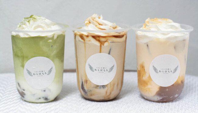 「とろり天使のわらびもち」の人気メニューはなんと言っても「飲むわらびもち」。アルバイトの女子高生が 「とろとろすぎて 、ストローで飲めちゃうのでは?」と発想し誕生した、飲むスイーツです。味はもちろん、そ の見た目の可愛さも相まって、たくさんの方にご愛飲いただいております。フレーバーは、黒蜜、ミルクティ ー、 抹茶の3種類をご用意しております。