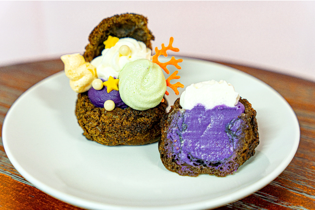 隠れた人気商品の「紅芋シュークリーム」。沖縄名物紅芋をふんだんに使用した贅沢な一品で、上品な紅芋クリームとこだわりクリームのハーモニーが絶品。こちらもまた色鮮やかでつい写真に納めたくなる一品。