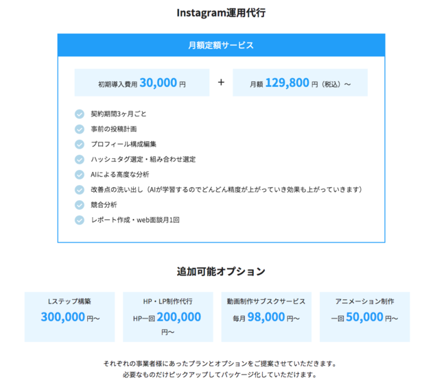 そういった事業者様に向けてAIを活用したInstagramの運用のサポートをし、フォロワー増加や増加や Instagramからの来店数の増加、求人応募数の増加などの目標にコミットしていきます。AIで実際何が解析できてどのようなサービスを提案できるのかなど詳しい詳細や導入までの流れなどご面談のご予約がこちらのリンクからできますので料金含めお気軽にご相談ください。