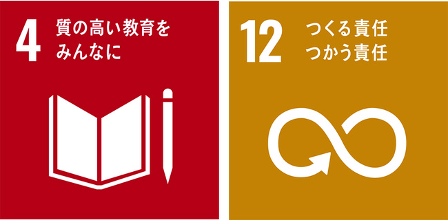 SDGsにおいては、「4.質の高い教育をみんなに」「12.つくる責任、つかう責任」 のゴール達成ために貢献します。