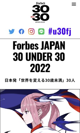 Forbes JAPAN 30 UNDER 30 JAPAN 2022:https://forbesjapan.com/30under30/2022/