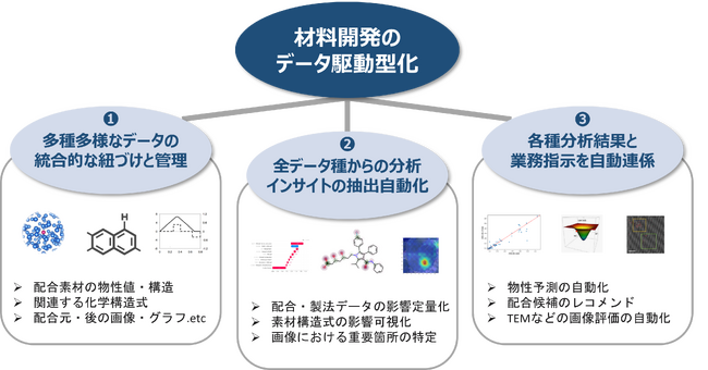 材料開発分野の競争環境は近年激化しており、求められる品質は高まる一方で、開発期間も短くすることが求められている状況にあります。これまで以上の品質達成には従来からある配合物・率に着目したデータ分析だけでなく、化学構造式や画像など多種データの分析が重要となりますが、開発期間を増大できないため不確実性だけが増す状況となりつつあります。