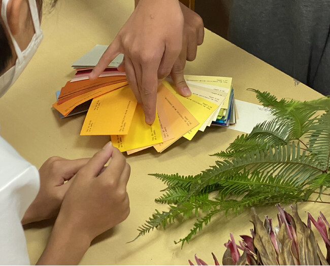 最初に「貼り箱の基礎知識」「ロスフラワーにまつわる社会課題」をお伝えし、その後「ドライフラワーを入れるのにぴったりな箱の色」を生徒の皆さんに考えていただきました。