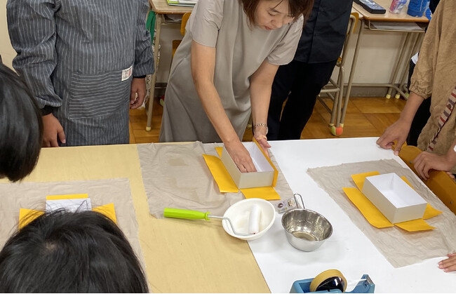 <ものづくりの楽しさ、やりがいを感じられるよう、特別授業を通じて貼り箱の企画と製作を経験>