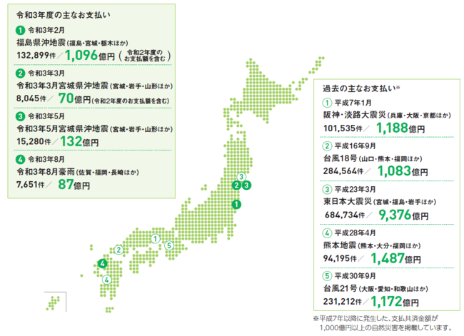 平成23年3月11日に発生した東日本大震災はJA共済事業開始以来、未曾有の災害となりました。JA共済連(全国共済農業協同組合連合会・代表理事理事長 柳井二三夫)では、被災された組合員・契約者の皆さまの早期の生活再建に向け、全国から延べ2,475人の自然災害広域損害査定員等を動員の上、JAとともに建物損害調査を実施し、9,376億円(684,734件)の共済金をお支払いしました。