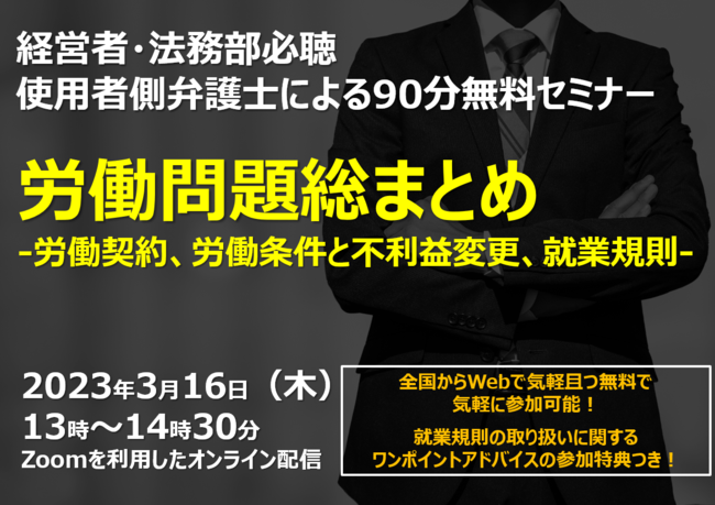 使用者側労務問題に精通した弁護士法人戸田労務経営(所在地:千葉県船橋市)は、「労働契約、労働条件と不利益変更、就業規則」を題材に、無料・オンラインセミナーを2023年3月16日(木)に開催いたします。