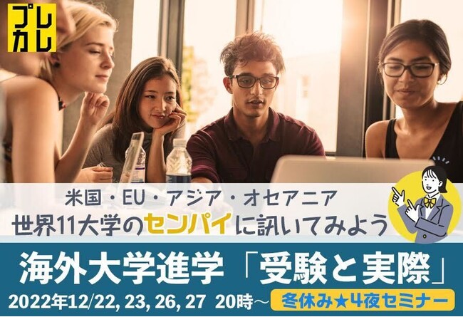 中高生セミナー「米国・EU・アジア・オセアニア11大学のセンパイに訊く!海外大学の受験と実際」を、2022年12月22日(木)、23日(金)、26日(月)、27日(火)に開催します。