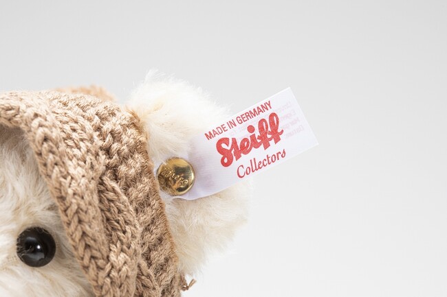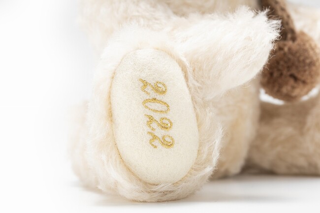 「ボタン・イン・イヤー」は、ドイツの職人の手作業で一体ごと丁寧に作られた伝統の逸品を証明するために、左耳についているタグです。限定のテディベアにはシリアルナンバーが刻まれた証明書が付いています。