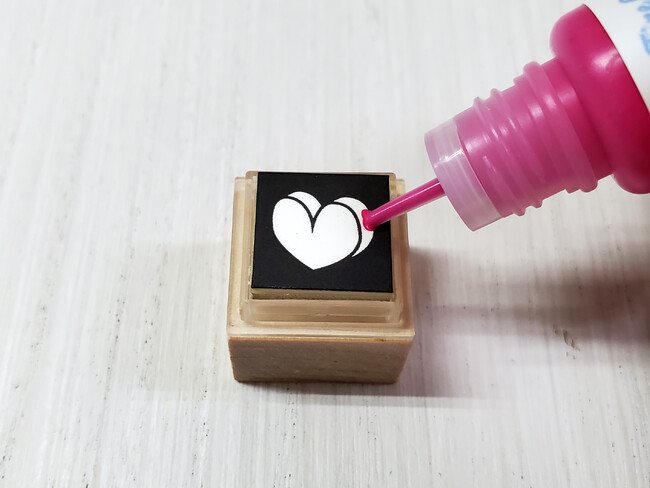 ファインカラースタンパー専用インクは、印面に直接塗り、3分ほど置いてからティッシュペーパー等で拭き取って使用します。