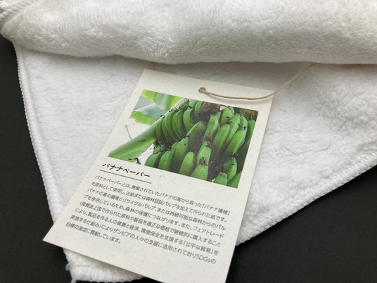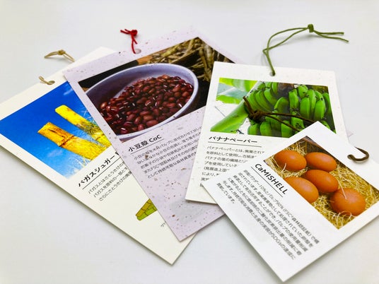 卵殻、バナナの茎、小豆の殻、サトウキビの茎など廃棄物を生まれ変わらせた紙で作成した商品タグ。
