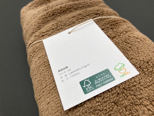 洋服などの廃棄コットンをアップサイクルした紙「サーキュラーコットンペーパー」を使用した商品タグ