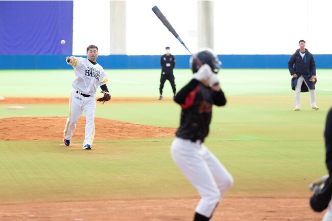 教室ではバッティング、ピッチング、守備に分かれ、約2時間にわたりプロ野球選手から直接指導が行われました。バッティング練習では、柳田選手と吉田選手が指導。柳田選手は子どもたちのスイングをチェックし「軸足で溜めを作りながら、ボールが来たらグッと前足を踏み込むことが重要」と説明、吉田選手は「素振りは、ただ回数を増やすだけでなく全力でスイングし、納得できる回数を行うことが大事」とアドバイスしました。