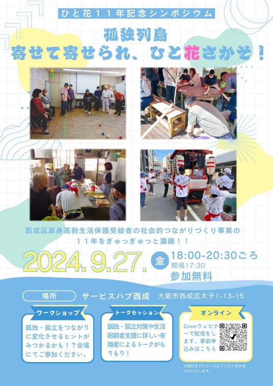 単身高齢者が多数生活する釜ヶ崎(大阪市西成区北東エリア・あいりん地区)で2013年から、孤独・孤立対策に向き合ってきた「ひと花センター」の11年間の活動報告・総括と今後の展望について考えるイベントです