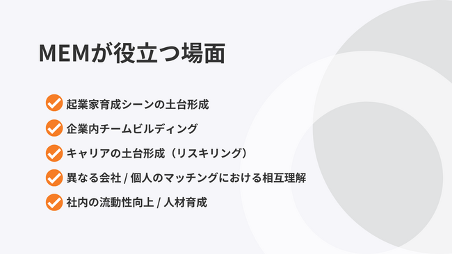 今の時代は未知へのチャレンジをチームで行い、新規事業を生み出すなど難しい課題に取り組む上では、これまで以上に人と向き合い、自分を表現し、コミュニケーションをとり関係性を築くことが必要となりますが、そのためには組織やチームなどの環境づくりがとても重要であると考え、MEM(メム)を開発いたしました。