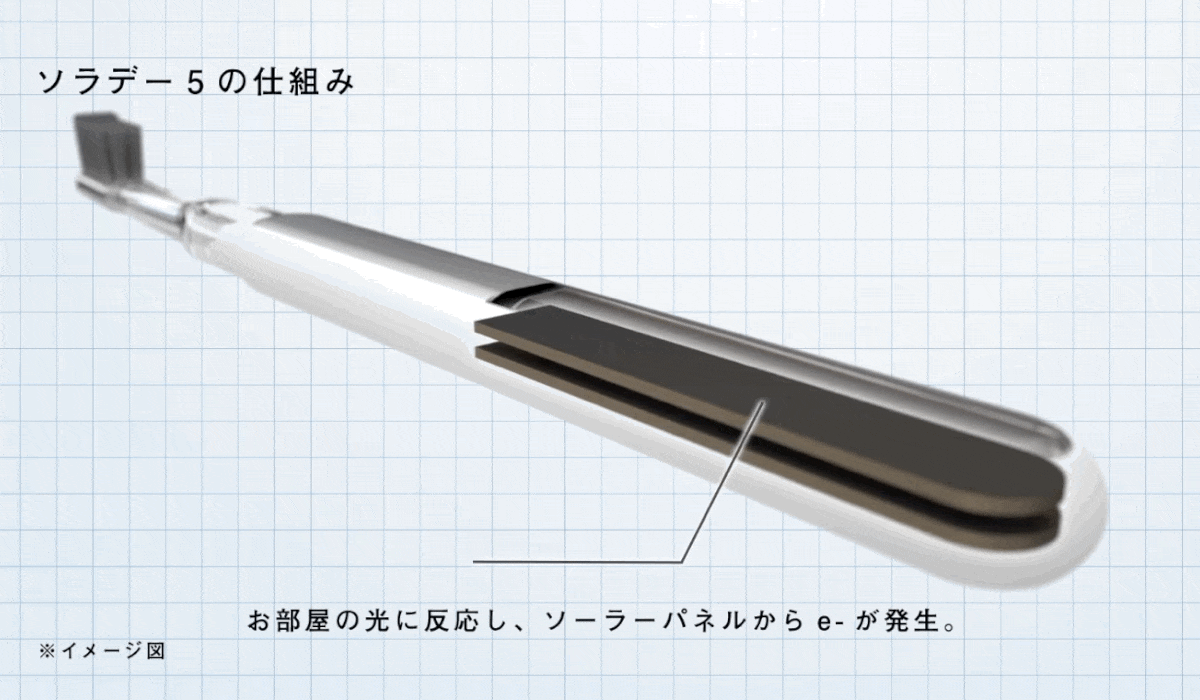 「ソラデー5」は、40年以上研究開発を続けている<TiO2半導体>と<ソーラーパネル>を歯ブラシに応用したソラデーシリーズの最新モデルです。