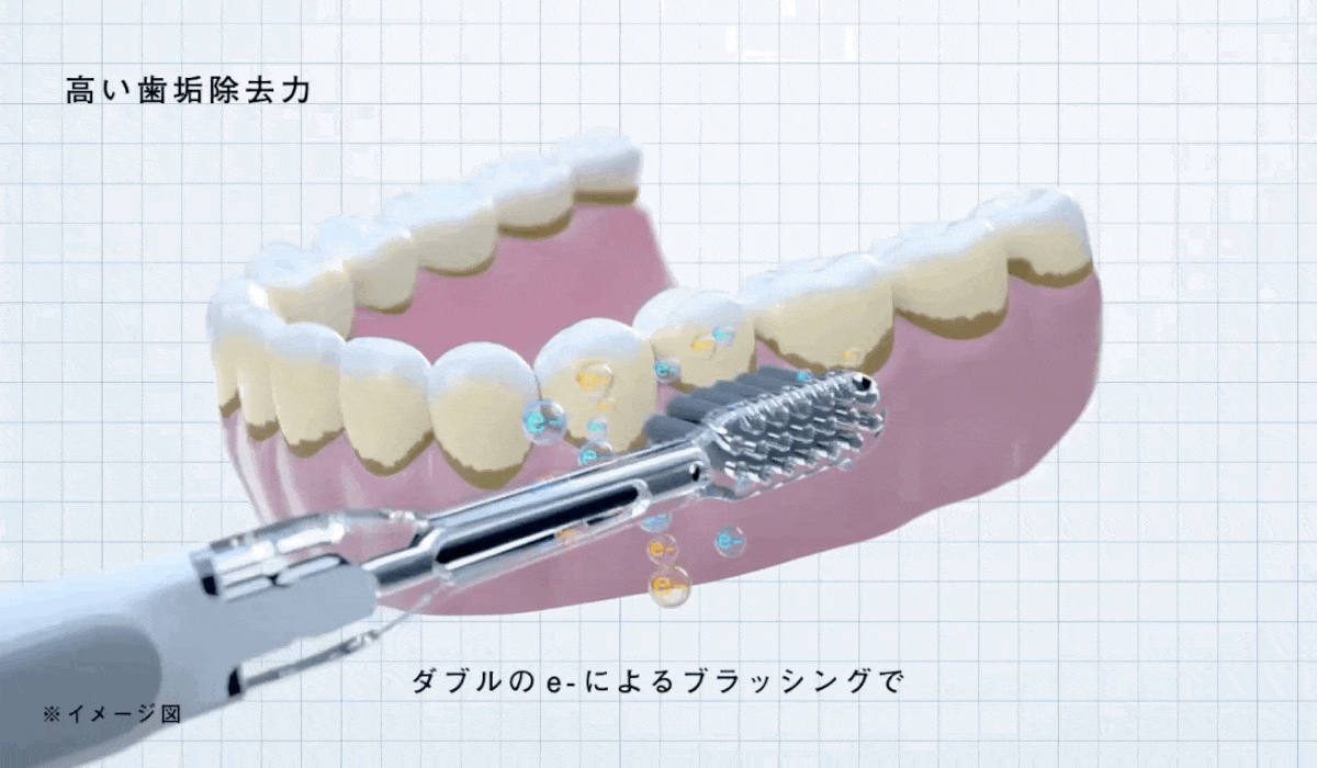 光と水を利用し、マイナス電子を発生させてブラッシングすることで、歯垢を効果的に除去する機能を装備。