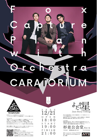 現代のジャズを主軸に新しい音楽表現を探求するプロジェクト"CARATORIUM(カラトリウム)"は、TBSドラマ「カルテット」や、映画・フジテレビ系月9ドラマ「コンフィデンスマンJP」シリーズの楽曲提供などで注目されるピアノトリオ "fox capture plan"とチェンバー・オーケストラが共演するイベント「Fox Capture Plan with Orchestra CARATORIUM」を東京都杉並公会堂大ホールで12/21(水)19:00より開催いたします。チケット販売開始は10/12 10:00【販売ページURL https://t.pia.jp/pia/event/event.do?eventCd=2235176 】