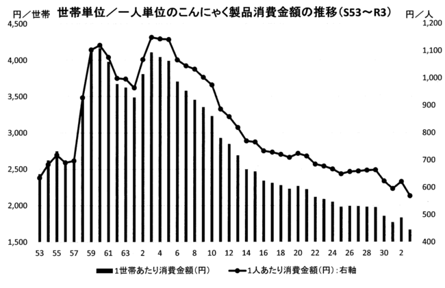 こんにゃくは古くから日本の食文化に根付いてきた伝統食材ですが、こんにゃくの原料となるこんにゃく芋は気象災害に弱く、収穫まで複数年を要するため、生産量および価格の変動が大きいという問題があります。また日本人の食生活の変化によりこんにゃくの消費量はピーク時の平成3年から令和元年に42%程度まで落ち込んでおり、慢性的な後継者不足も相まって、多くのこんにゃく製造企業は廃業や倒産を余儀なくされ、日本の伝統的産業であるこんにゃく産業の衰退に歯止めがかからない状況です。