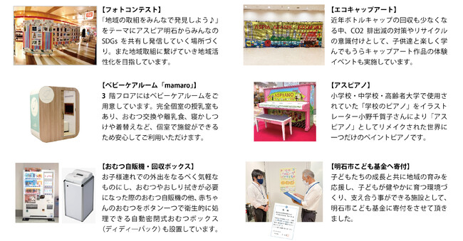 アスピア明石は「SDGs未来安心都市・明石」の推進に貢献するため「あかしSDGsパートナーズ」に加盟し、地域と連携して活動しています。「ミライへつづけ!アスピア明石 みんなのSDGs」をテーマとして明石市こども基金等への募金活動を通じて、こども達の未来を応援しています。
