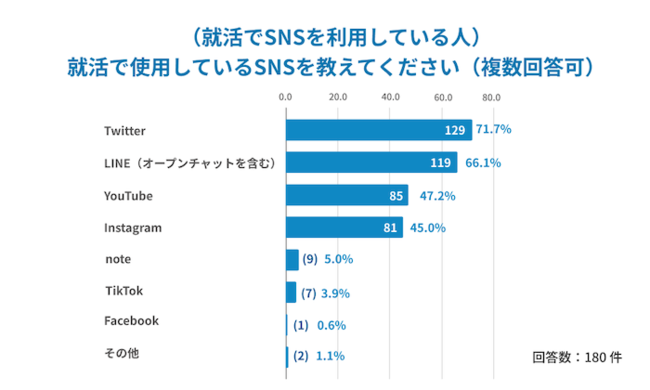 就活生のこれまでの情報収集は就活サイトが中心でしたが、現在はTwitterをはじめとしたSNSに変化しており、またコロナ禍で大学での交流が少なくなったことで、就職活動生同士の情報交換でもSNSを活用した動きが活発化しています。SNSの中でも就活生の約7割がTwitterを通して就活情報を収集しており、企業側からもTwitterを通して多くの学生へリーチすることが求められています。