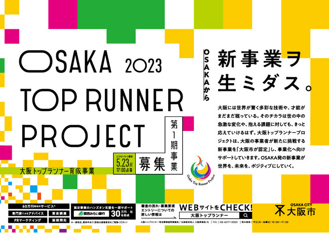 公益財団法人大阪産業局では、大阪市が認定する「大阪トップランナー育成事業」において、新たな需要の創出が期待できる製品・サービスの事業化をめざす企業のプロジェクトを募集します。