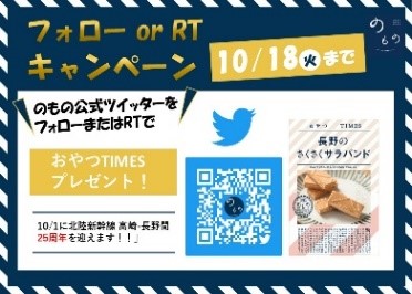 「のもの」Twitter (https://twitter.com/nomonokun)を「フォロー」もしくは「投稿内容をリツーイト」し、レジスタッフに画面を提示していただくと、10月1日の北陸新幹線25周年を記念して、のものオリジナル商品「おやつTIMES 長野のさくさくサラバンド」をプレゼント!