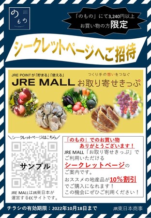 一回のお買い物で¥3,240(税込)以上ご購入のお客さまに、のものバイヤーが厳選した旬のフルーツやクラフトビールのセットなど、地域のグルメをお得に購入できるJREMALLシークレットページをご案内!