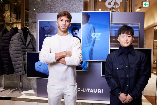 この記念すべき、ポップアップストアのオープン初日の10月5日(水)には、ブランドがメインスポンサーを務めるフォーミュラ1チームのスクーデリア・アルファタウリのドライバー、ピエール・ガスリーと角田裕毅がアルファタウリの2022秋冬コレクションを纏い会場に来店しました。