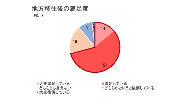 まずは、移住する前と後で、生活の満足度がどのように変化したかを5段階評価で聞いてみました。移住者の7割以上が移住前の生活と比べて満足度が高いという結果となりました。