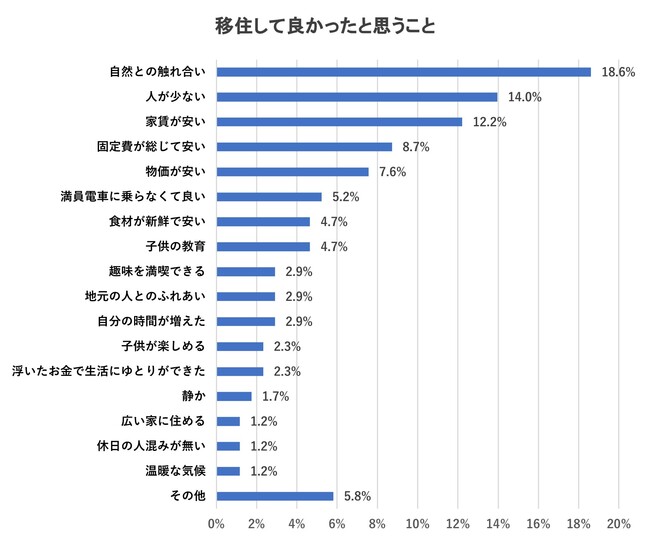 その他にも、「人が少ない」や「満員電車に乗らなくて良い」という回答も上位に入りました。都市部では休日の外出時も人が多く混雑することがしばしば。地方へ移住した結果、飲食店での待ち時間が無く、車や公共交通機関での移動時間がストレスに感じなくなったことが、移住してよかったと思うことにつながったようです。