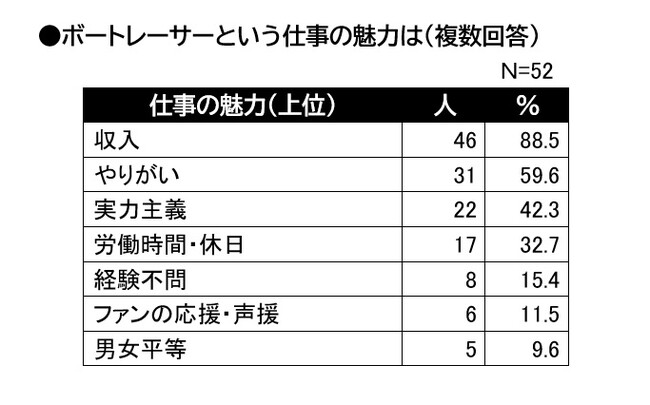 最後に、女子レーサーが目標とする「一流のボートレーサー像」について聞きました。一流に必要な条件は、約6割が「安定してよい成績」(31人)を挙げました。確かな実力があれば、タイトルや賞金は後からついてくるということでしょう。次いで「選手仲間や関係者からの信頼」(24人)、「ファンからの支持・人気」(20人)です。ボートレーサーとして仕事ができるのは、周囲の支えがあってこそというプロフェッショナルの自覚がうかがえました。