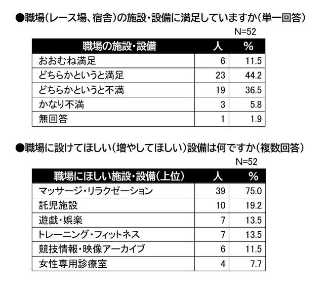 「職場に設けてほしい(増やしてほしい)施設・設備」は、「マッサージ・リラクゼーション」(39人)が最多となりました。身体が資本のアスリートだけに、心身をケアする設備を求めているようです。続いて多かった回答は「託児施設」(10人)です。出産後に復帰する選手が増えていることの表れと言えます。なお、現在の規則では、出場期間中は家族であっても接触・連絡は出来ません。
