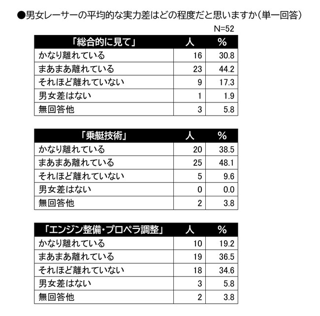 エンジン整備・プロペラ調整についても、「かなり離れている」(10人)と「まあまあ離れている」(19人)が半数以上でした。しかし、「それほど離れていない」(18人)と「男女差はない」(3人)も合わせて4割で、乗艇技術ほどの差は感じていないようです。