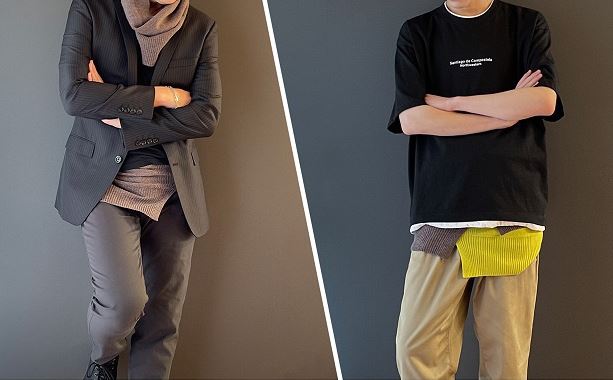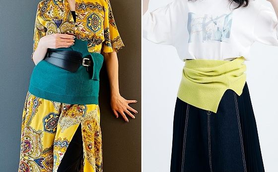 長さ違いを上にして着用し、ベルトの上から折り返してスリットの動きを楽しむアレンジです。