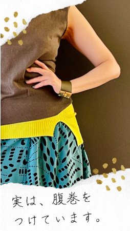 基本は片方を長めにしてお尻まですっぽり温めて。上から別のトップスを着用すると重ね着風に。スリットデザインでハラマキ感ゼロ!